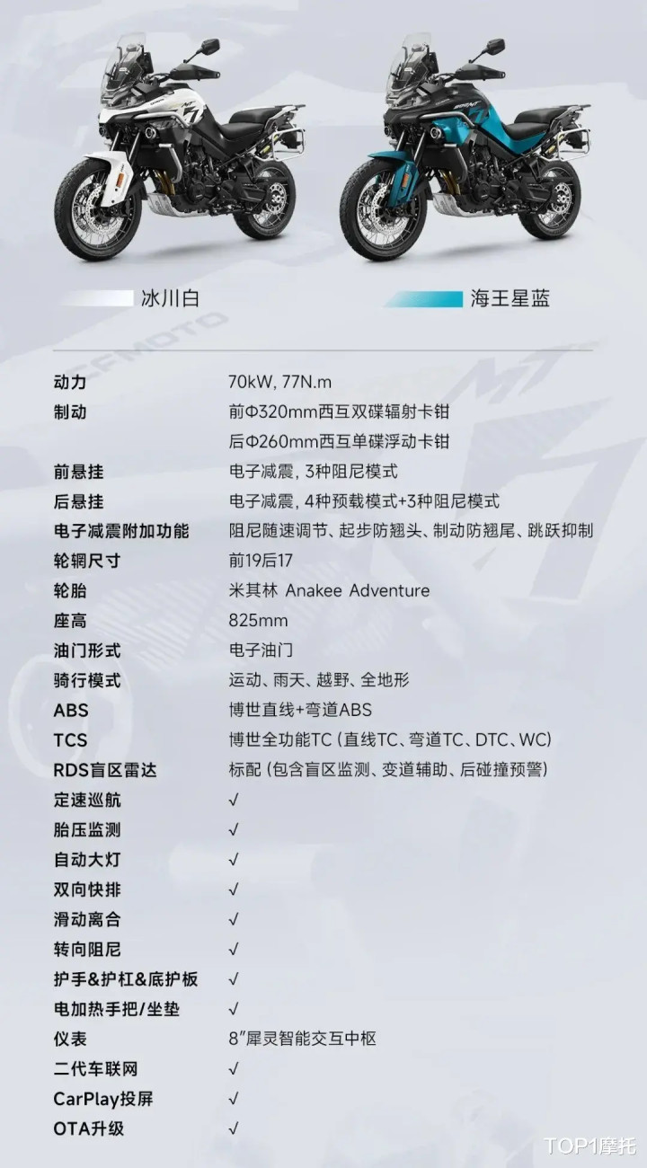 而且,伴随电子减震而来的还有一些附加功能,比如阻尼随速调节,起步防翘头,制动防翘尾,跳跃抑制。电子减震除了提供更高的舒适性和更简单的调节方式之外,还能让减震更智能,更能贴合不同的使用场景,对于春风800MT这种公路ADV车型来说是一个大加分项。