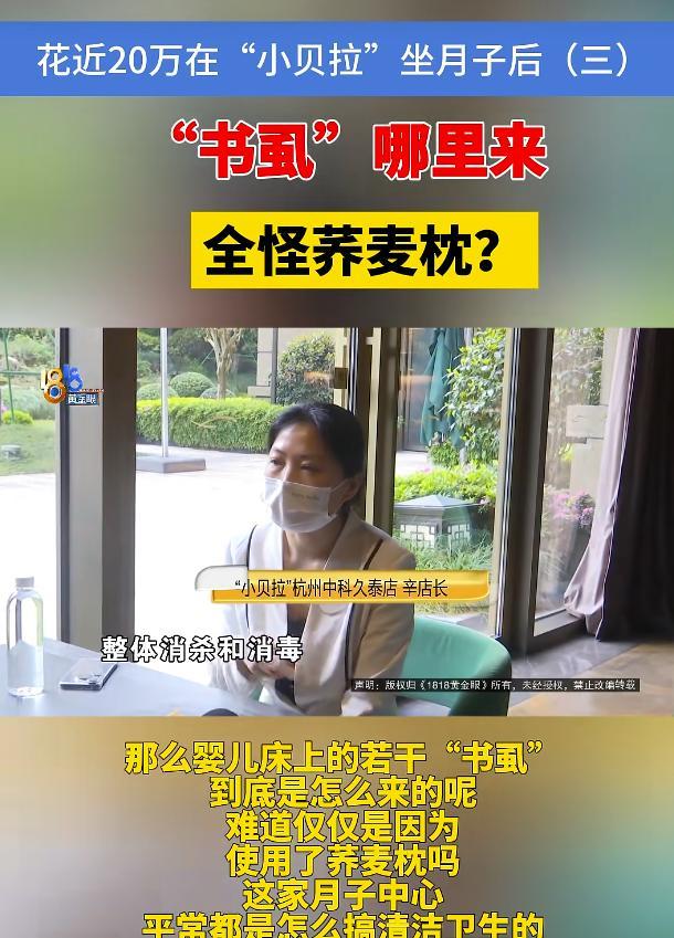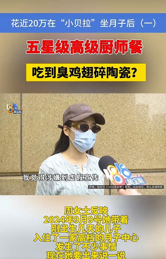 周女士反映,她2024年花了近20万住进杭州一家月子中心,还花了将近10万做产康。但周女士在此居住时,先是月子餐配的是炸薯条、炸蘑菇、冰凉的奶昔,还有鸡翅是臭的,吃出碎陶瓷片,之后被升级到另一家门店,又发现婴儿床上有很多只小虫子,周女士称,月子中心鉴定出来的是“书虱”。