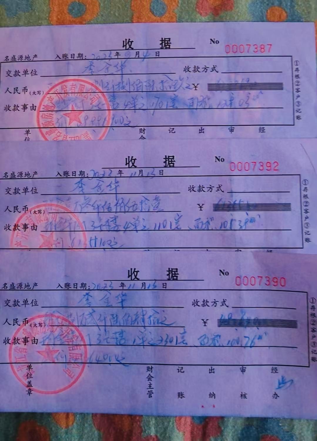 ▲李金华在铂金华府三套房屋的购房款收据