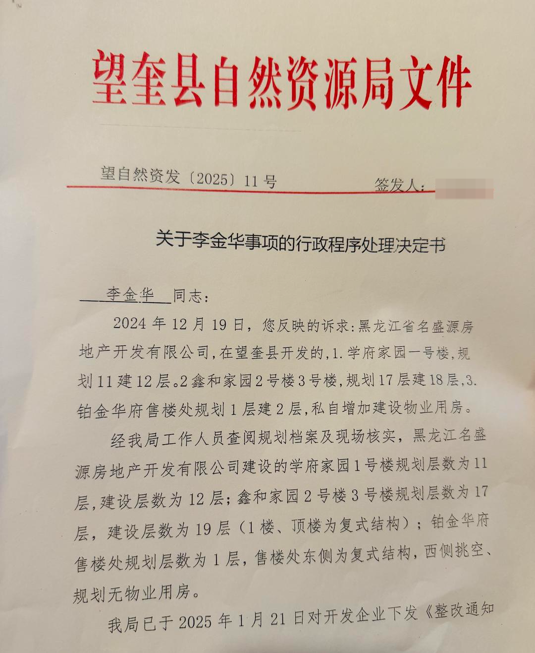 红星新闻记者获得的望奎县自然资源局的一份文件显示,针对铂金华府售楼处规划1层建2层和私自加建物业用房的情况,已在2025年1月21日对名盛源公司下发《整改通知书》。