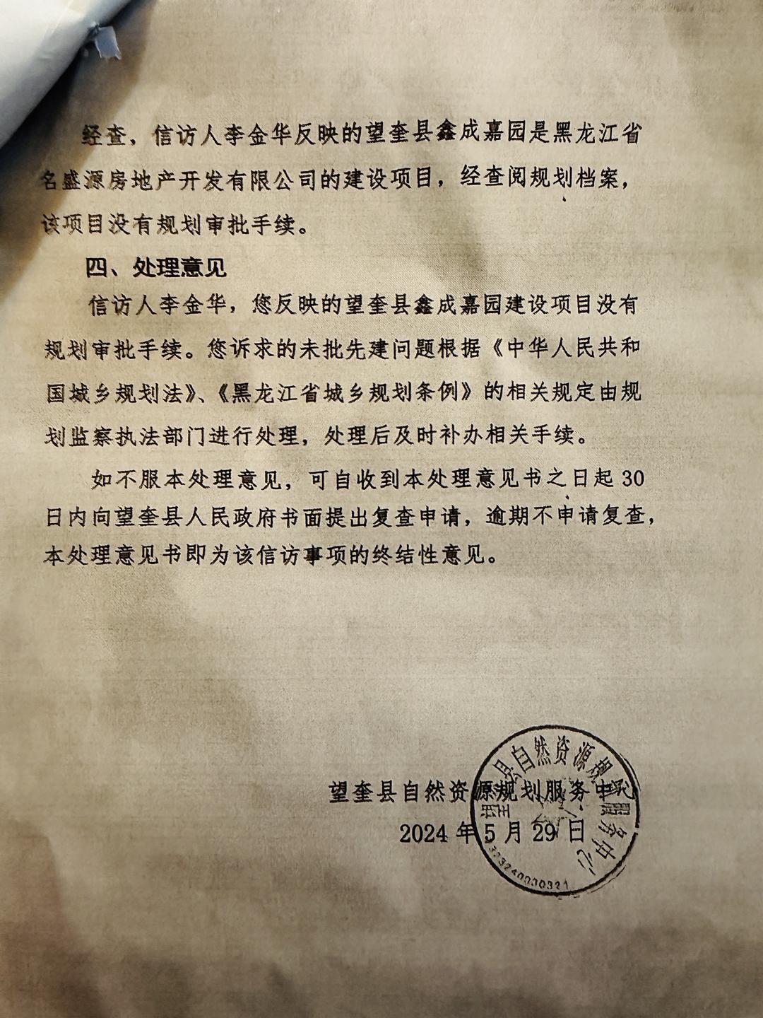 上述鑫成嘉园“未批先建”的情况,望奎县住建局和自然资源规划服务中心曾于2024年5月29日书面回复举报人李金华称,经查,名盛源公司在建设该项目时没有办理施工许可证、没有规划审批手续。