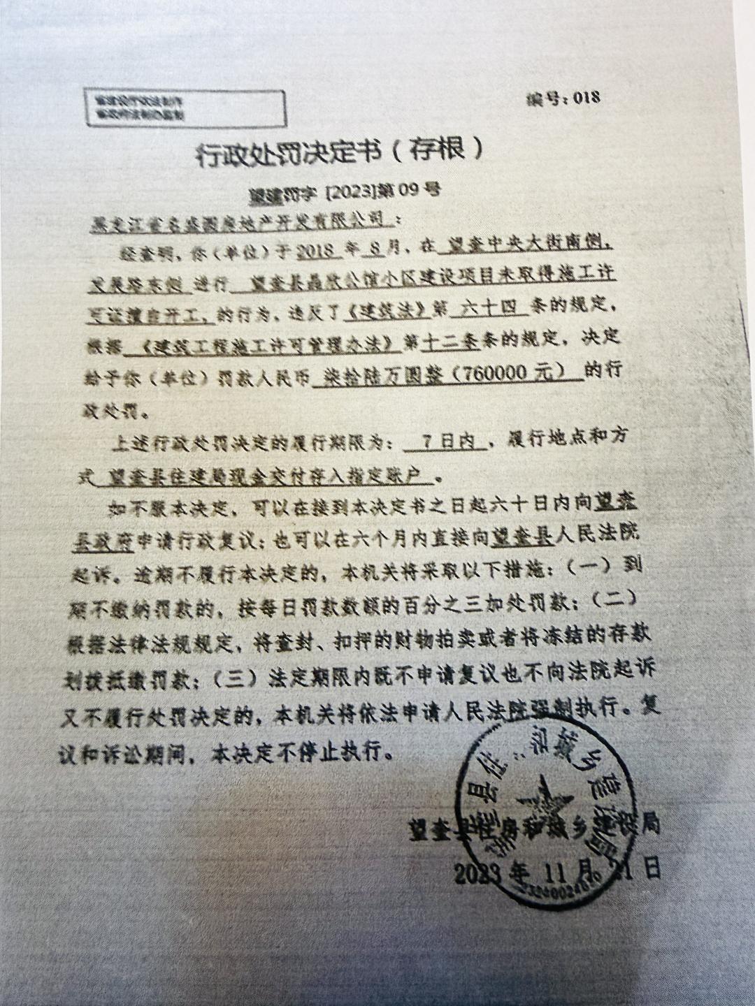 ▲望奎县住建局的处罚决定书,名盛源地产公司被罚款76万元