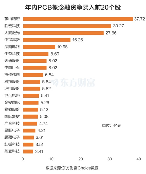 在行业高景气下,年内杠杆资金也在积极抢筹相关概念股。东方财富Choice数据显示,东山精密为PCB概念板块被融资净买入最多个股,为37.72亿元。胜宏科技紧随其后,被融资净买入30.27亿元。大族激光、中钨高新、深南电路也被融资净买入超10亿元,分别为27.66亿元、16.26亿元和10.95亿元。