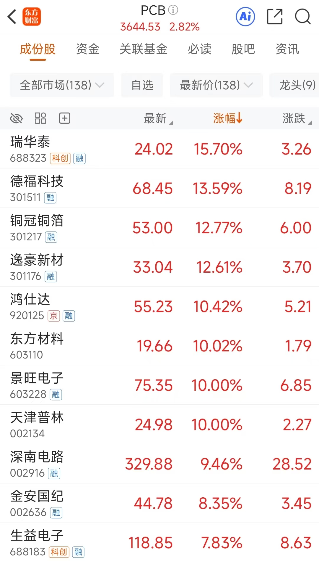 PCB(印刷电路板)板块4月27日早盘表现强势,东方材料、景旺电子、天津普林涨停;瑞华泰、德福科技、铜冠铜箔、逸豪新材、鸿仕达大涨超10%;深南电路、金安国纪、生益电子明显跟涨。