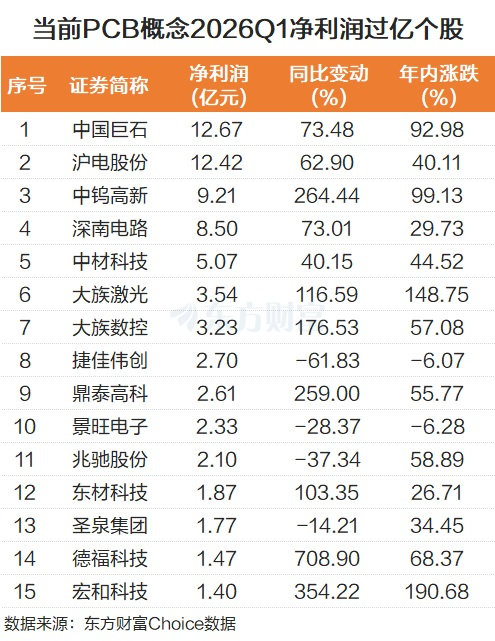 这也带来了产业链盈利能力的显著提升。东方财富Choice数据显示,PCB概念中当前有56股披露了2026年一季报,合计实现归母净利润79.9亿元,同比增长53.62%。